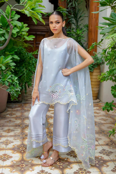 Romantic and soft drapery take center stage in this exquisite powder blue organza cape, adorned with delicate pastel eyelet details. The fluidity of the monochrome ensemble is perfectly complemented by a crepe slip and flared, pure raw silk culottes. With a relaxed fit and elegant design, this outfit offers effortless sophistication for any occasion. The cape’s front length measures 29", while the full length reaches 57", providing a flattering and graceful silhouette. Ideal for those who appreciate timeless elegance with a modern twist.