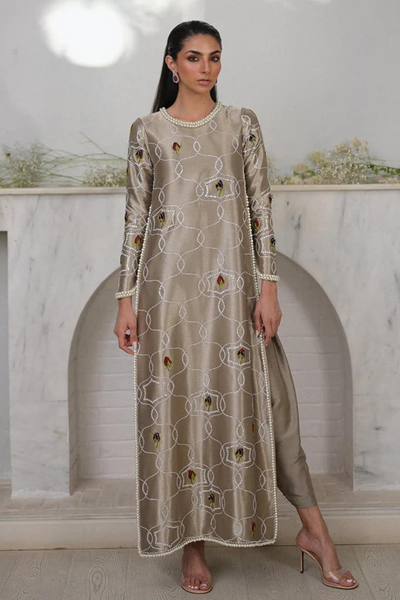 This elegant metallic slate-colored tissue column shirt is exquisitely hand-embellished with appliquéd velvet roses and features a chic keyhole neckline. Accentuated with beaded borders for an added touch of luxury, the shirt is paired with a matching raw silk shalwar, offering a perfect blend of opulence and sophistication. The outfit's intricate detailing and graceful silhouette make it ideal for upscale events. With a shirt length of 56" and a model height of 5'10", this design combines timeless elegance with modern artistry, making it a standout choice for any occasion.