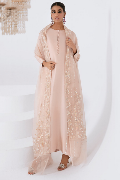 The “Name” ensemble from S|K BERYL THE CRYSTAL'23 is a breathtaking combination of elegance and opulence. This design features exquisite hand-done crystal embellishments on both the front and back, enhancing its luxurious appeal. The ensemble is completed with a heavy hand-embellished organza dupatta, adding a dramatic yet refined touch. Crafted from 80gm pure raw silk in a soft nude blush hue, this piece is perfect for those special occasions that demand sophistication and glamour. Authenticity guaranteed.