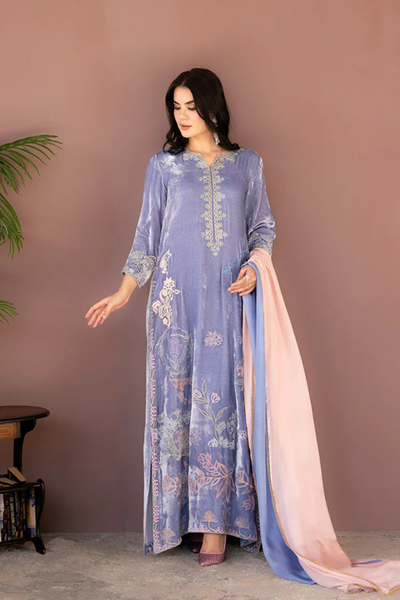 This luxurious ensemble in purple blue features a pure French velvet embroidered kaftan, offering a rich, opulent texture with detailed embroidery. The pants are made from raw silk, providing a smooth, sophisticated finish. The dupatta is crafted from Kattan Organza, a delicate and sheer fabric that adds a graceful, airy quality to the look. Designed by Shazia Rauf Khan under the Dilkash brand, this outfit guarantees 100% original, authentic fabrics, ensuring impeccable quality and timeless elegance for special occasions.