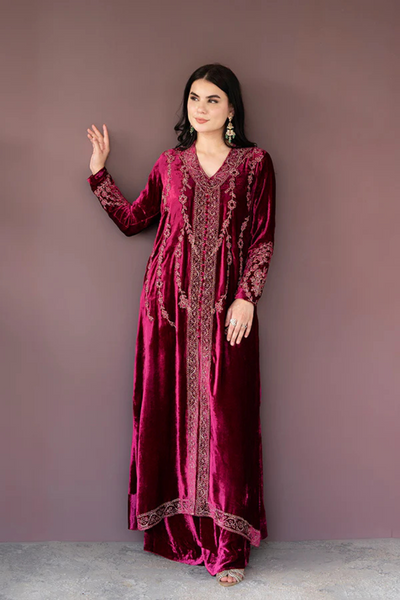 This stunning ensemble in cherry features a pure French velvet embroidered kaftan, offering a rich, luxurious texture with intricate embroidery. The pants are crafted from pure French velvet, ensuring a cohesive and elegant look. The dupatta is made from Kattan Organza, a light, delicate fabric known for its sheer and graceful quality. Designed by Shazia Rauf Khan under the Dilkash brand, this outfit guarantees 100% original, authentic fabrics, making it a perfect choice for those seeking sophisticated style and timeless elegance for special occasions.