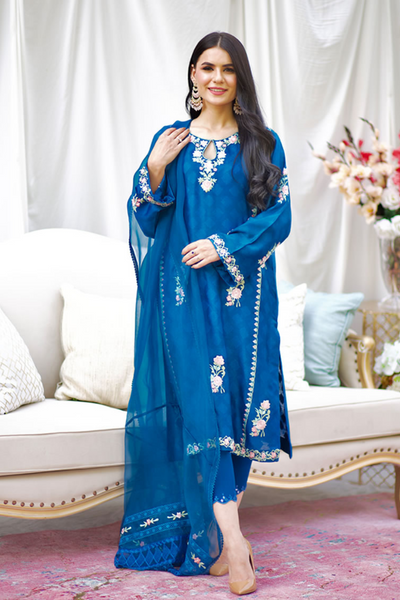Shirt Cotton net teal blue embroidered Pants crepe teal blue embroidered Dupatta organza teal blue embroidered and laces