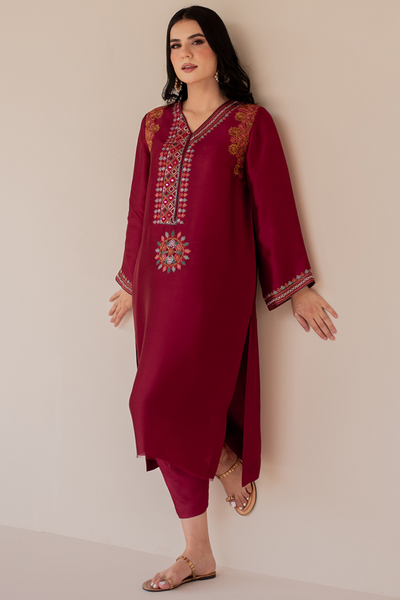 This stunning deep red ensemble from Shazia Rauf Khan's "Naqsh Edit-II'23" collection features intricate resham embroidery with mirror work, adding a radiant touch to the design. The kurta, crafted from pure kora silk, offers a smooth and luxurious feel, while the skinny raw silk shalwar provides a sleek and modern silhouette. The embroidered organza dupatta adds an elegant finishing touch to the outfit. Slips are included for added comfort. This 100% original creation perfectly blends traditional craftsmanship with contemporary style, making it ideal for special occasions.