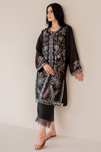 This elegant black ensemble from Shazia Rauf Khan's "Naqsh Edit-II'23" collection features intricate resham embroidery and hand embellishments, creating a luxurious and detailed design. The kurta, made from pure kora silk, offers a refined and graceful silhouette, while the culottes capri in raw silk add a contemporary edge to the look. The organza dupatta complements the ensemble with its delicate texture. Slips are included for added comfort and convenience. This 100% original creation blends traditional artistry with modern style, making it a perfect choice for any sophisticated occasion.