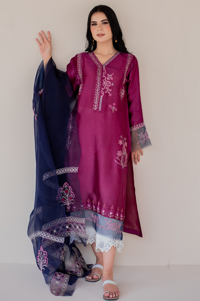 This stunning magenta ensemble from Shazia Rauf Khan's "Naqsh Edit-II'23" collection features exquisite resham embroidery with mirror work, adding a sophisticated and radiant touch. The kurta, crafted from pure kora silk, exudes luxury and elegance, while the culottes capri in raw silk provide a modern and chic silhouette. The organza dupatta complements the look with its delicate and airy texture. Slips are included for added comfort. This 100% original creation is the perfect fusion of traditional craftsmanship and contemporary style, making it an ideal choice for festive occasions.