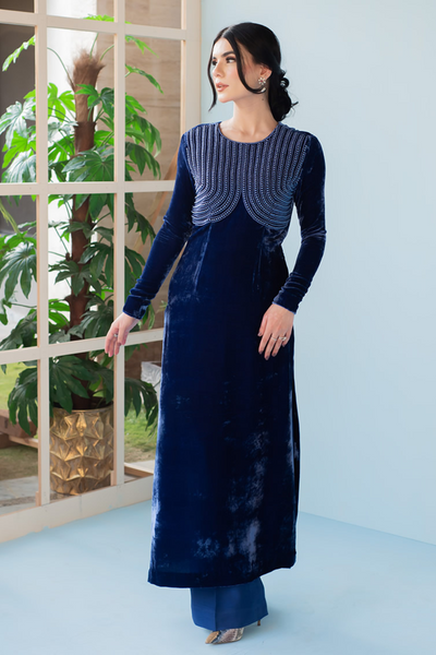 This elegant ensemble from Shazia Rauf Khan Velvet'22 features a pure French velvet shirt adorned with intricate hand-done embellishments using self-coloured pearls, creating a refined and luxurious look. It is paired with tailored K-Raw silk boot leg pants for a sleek silhouette. The outfit is beautifully completed with a pure organza dupatta, enhanced by medium silk colour block scalloped inward trims and delicate pearl hangings. Ideal for formal gatherings, the set offers a customisable colour option to match your unique taste.