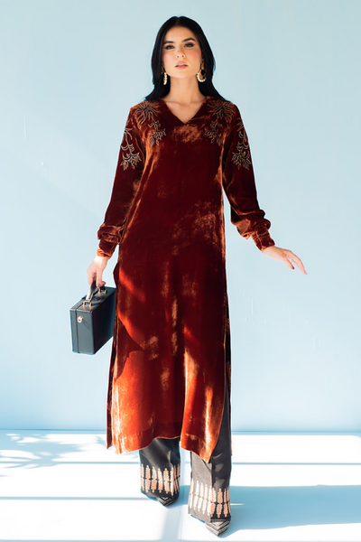 This elegant ensemble from Shazia Rauf Khan Velvet'22 features a pure French velvet embroidered shirt paired with K-Raw silk embroidered pants, offering a luxurious yet graceful look. Ideal for formal gatherings or evening occasions, the refined embroidery adds depth and richness to the outfit. You can also customise the colour to suit your personal style or event theme, ensuring a perfectly tailored experience.