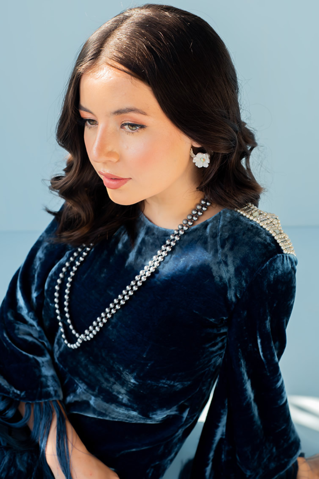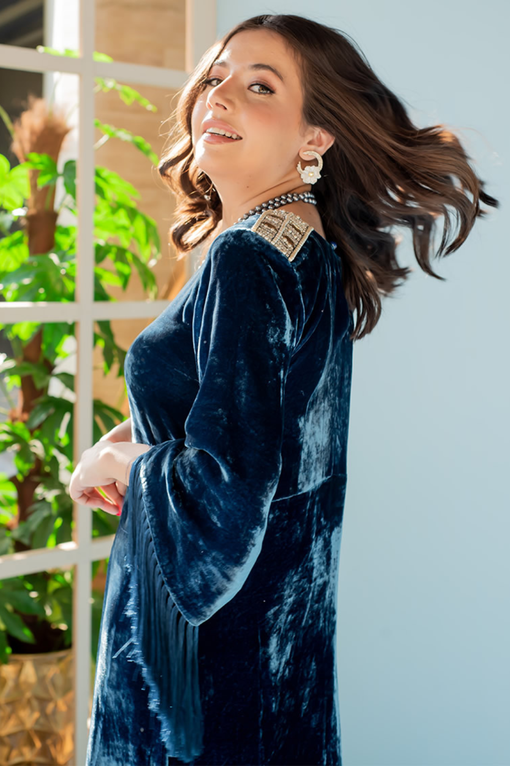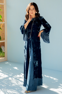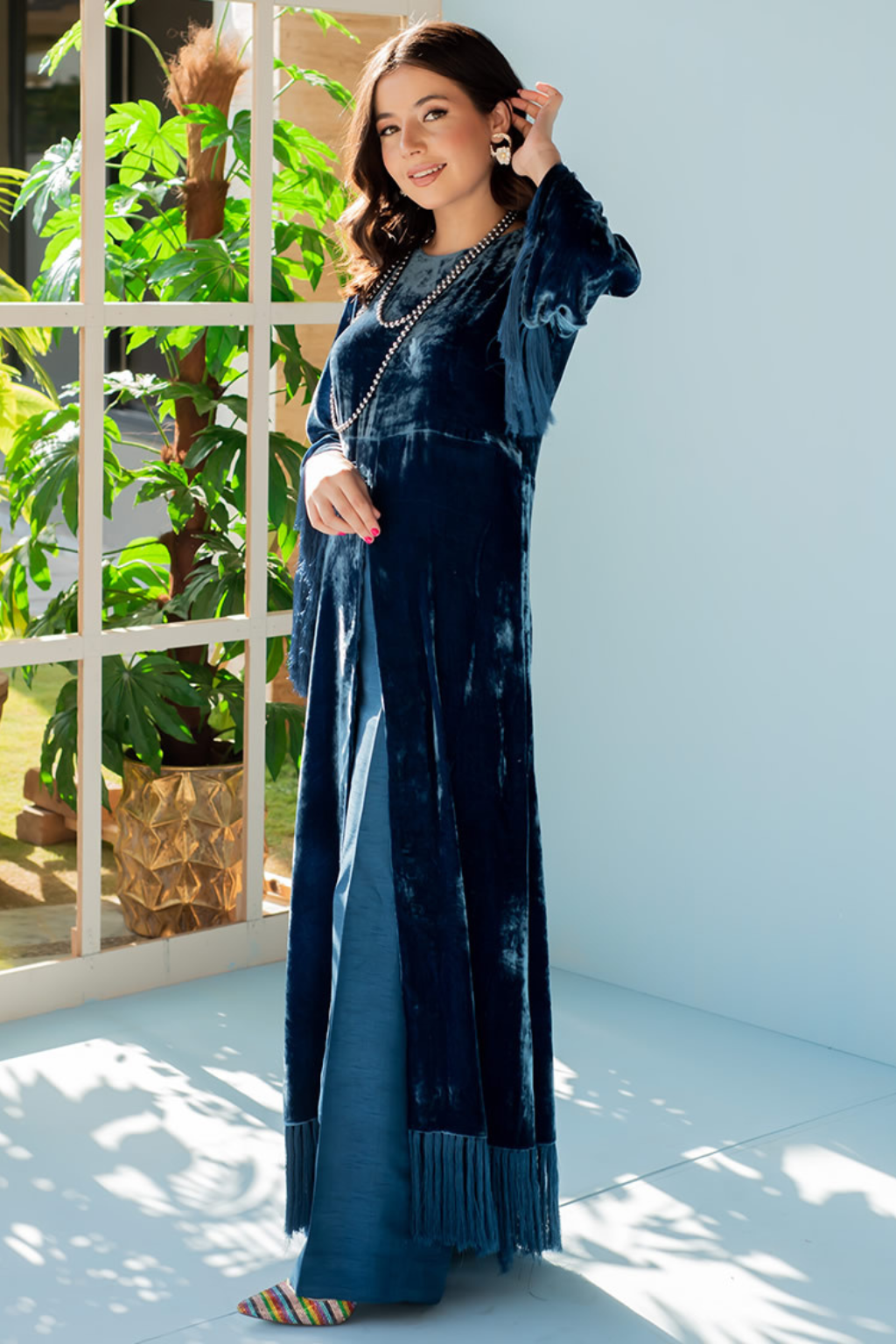This elegant outfit from Shazia Rauf Khan Velvet'22 showcases a pure French velvet shirt adorned with hand-done embellishments on the shoulders, adding a refined touch of craftsmanship. The design is elevated with tassel details on the daman and sleeves, blending traditional charm with contemporary flair. Paired with Korean raw silk bootleg trousers, the ensemble ensures both sophistication and comfort. With the option to customize the color, this outfit is perfect for formal occasions or festive events, offering timeless style and luxurious appeal.