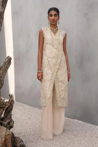 This modern take on the traditional angrakha from Saira Shakira's Dahlia Luxury Pret'23 collection blends classic elegance with contemporary chic. The crossover design, crafted from Korean raw silk and appliquéd onto organza, creates a stunning sheer effect. The floral appliqué is delicately embellished with crystals and pearls, adding a touch of opulence. A thin crystal placket runs down the front, further enhancing its sophistication. Paired with pure raw silk pants, this ensemble is perfect for those seeking a stylish yet timeless look.