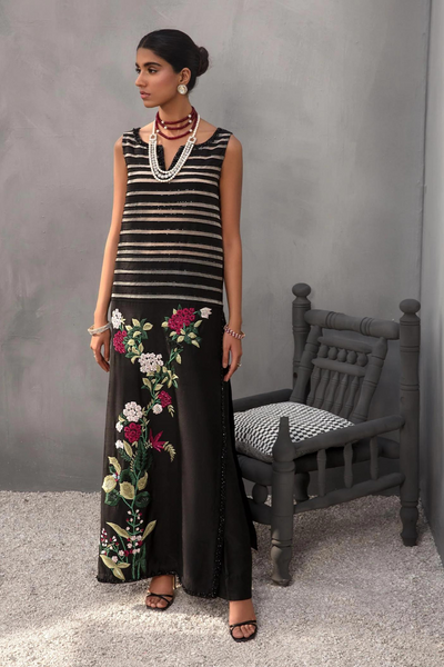 This stunning monochrome kaftan-style top from Saira Shakira's Dahlia Luxury Pret'23 collection exudes chic modern elegance. The raw silk and organza top features striped appliqué, each stripe lined with black Swarovski crystals for a touch of sparkle. The lower half of the top is adorned with exquisite floral embroidery, beautifully embellished with sequins, crystals, and pearls, adding a luxurious feel to the design. Paired with matching raw silk pants, this ensemble is perfect for those seeking sophistication with a modern twist.