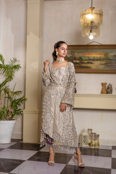 A modern silhouette with an A symmetric hem is an epitome of grace and flamboyance. A pure rose gold tissue surface endorsed with silver embellishments of sheeshakari, jarai and kheecha work, paired with a contrasting plum raw silk crop pants with a scalped border making this attire class apart