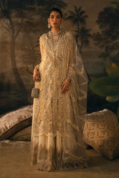 Sana Safinaz Nura Festive Vol-4 features a stunning cream ensemble crafted from organza and raw silk. The shirt showcases intricate cutwork and embroidered detailing with embellished laces. Paired with a beautifully embroidered lehnga, it features a rich lace border and a raw silk slip for added elegance. The ensemble is complemented by a square net dupatta in cream beige, adorned with organza borders and embellished tassels. This exquisite set, perfect for festive occasions, combines timeless beauty with intricate craftsmanship, ensuring a sophisticated and graceful look. 100% original.