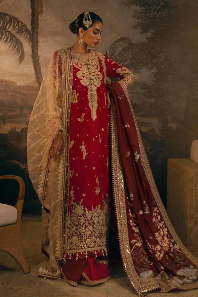 Sana Safinaz Nura Festive Vol-4 presents an elegant ensemble crafted with embroidered raw silk in red, featuring intricate detailing on the shirt front, back, and sleeves. The shirt is complemented with maroon raw silk borders and lace, while the daman is adorned with organza red chatta pati. A creamy beige net dupatta adds a soft, graceful touch, paired with a digital velvet shawl and embroidered organza borders. The outfit also includes a printed garara with dyed red and embroidered pati accents. Perfect for festive occasions, this design is an epitome of sophistication and craftsmanship.