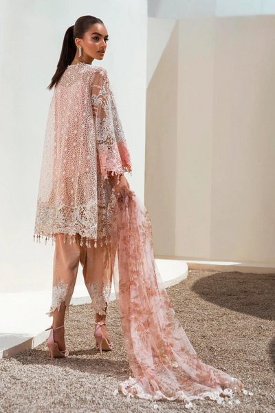 This exquisite ensemble from Sana Safinaz's Nura Festive Vol.1-24 collection exudes sophistication, featuring soft pink net adorned with intricate embellishments and embroidery. The shirt is crafted with beautifully embroidered panels, complemented by delicate lace and borders. The sleeves are enhanced with embellishments, while the dupatta showcases digital prints with embroidered bunches and a lavish organza pallu. Paired with a peach raw silk trouser featuring an embroidered border, this outfit is a perfect blend of poise and finesse, adorned with floral motifs and bejeweled accents. Authenticity Guaranteed 100% Original.
