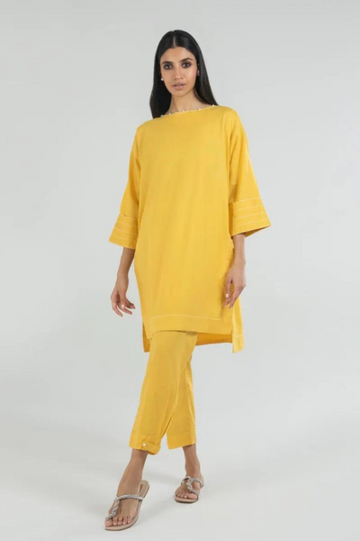 Description: A minimalistic composition is portrayed on this elegant ensemble rendered in sunflower yellow shade. It features a contemporary silhouette shirt adorned with trendy top stitches and glistening pearl details. Styled with a matching pants, this classy outfit is a perfect option for everyday events.