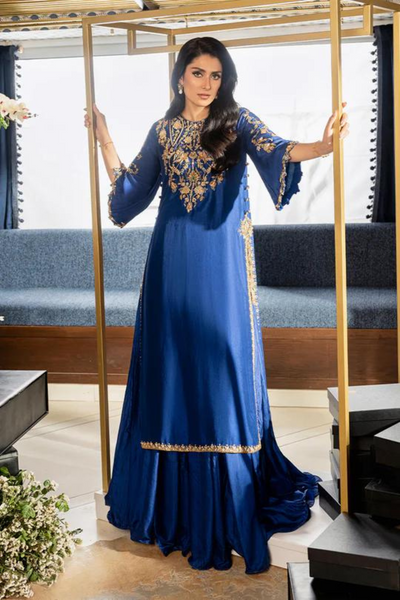 Sapphire by Sunnia Manahil Lumierie '23 is an enchanting ensemble that radiates elegance. The long shirt, crafted from luxurious raw silk, is adorned with delicate hand embroidery and charming side tassels, adding a touch of grace and sophistication. The Kattan silk lehenga enhances the opulence of the outfit, creating a regal look. Draped in mesmerizing hues of blue, Sapphire is the perfect choice for making a grand entrance at any occasion. Step into the limelight with this exquisite masterpiece and captivate everyone around you!