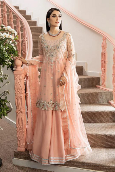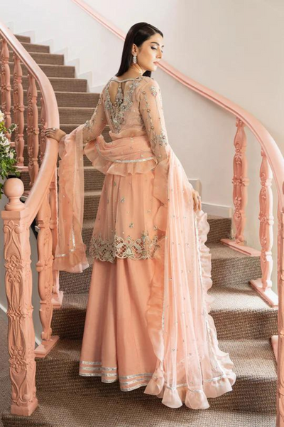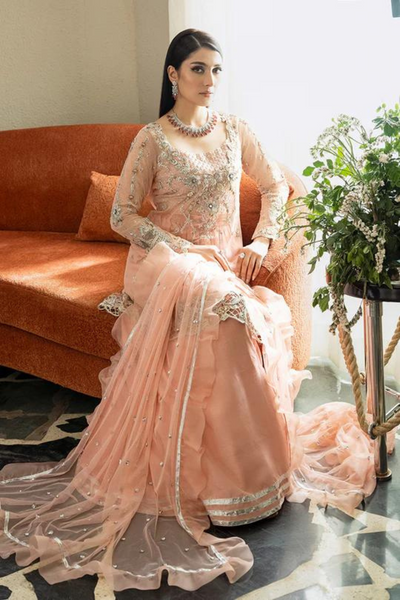 Mia by Sunnia Manahil Lumierie '23 is an enchanting ensemble that radiates elegance. The delicate French net short shirt is adorned with intricate hand embroidery, creating a refined and captivating look. The luxurious silk lehenga perfectly complements the shirt, adding grace and sophistication. In a soft peachy pink hue, Mia is the ultimate pick for an enchanting evening, designed to effortlessly captivate attention with its charm. This exquisite ensemble is a must-have for any special occasion, blending tradition with modern beauty.