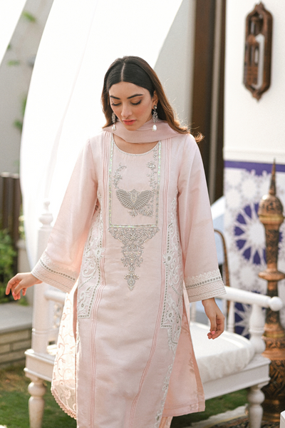 This exquisite ensemble features a blush pink pure 80-gram raw silk shirt, adorned with resplendent pearl dabka and stone detailing on the neckline. Gorgeous ari work motifs in shades of light grey and white, inspired by Arabian art, elegantly decorate the sides of the shirt. Paired with a stunning organza dupatta, featuring beautiful embroidery along the border, and a classic lace shalwar, this outfit exudes sophistication. Perfect for any occasion, this design from Zabric will elevate your style with unmatched elegance.