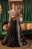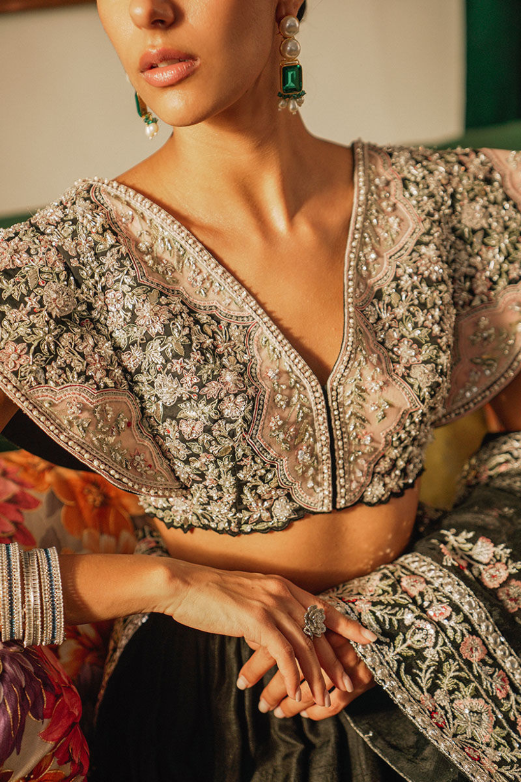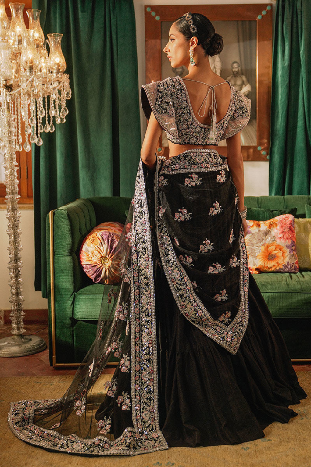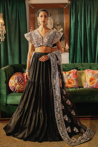A raven colored ruffled lehnga with a V neck ruffled sleeve blouse. Beatified with dusky pink embellishment details, glittering sequins, embroidery and handcrafted details on the blouse and dupatta with a heavy broad border with floral motifs all over. Choli length: 14.5 Front depth: 9.5 Back depth: 9.5 - Price mentioned is for Lehnga & Choli Delivery within 1.5 to 2 months.