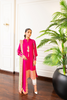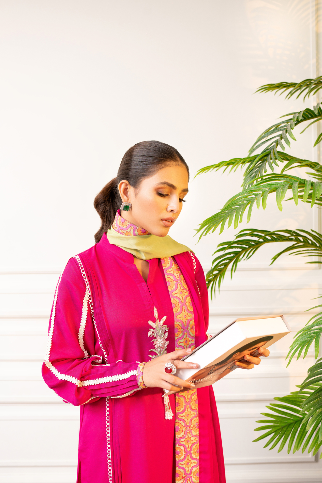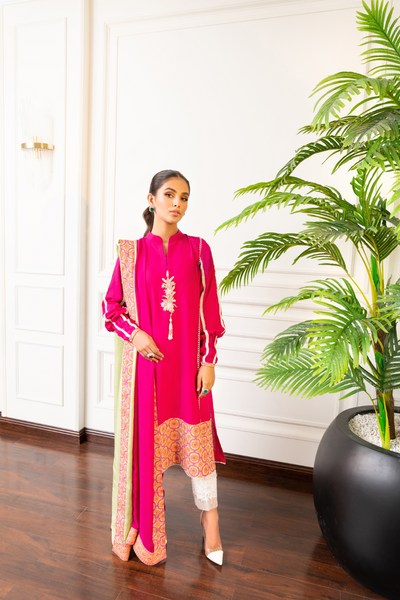 This hot pink shirt from Zainab Salman’s Mirage Luxury Pret collection is adorned with a beautiful embroidered motif and finished with tassels, along with block-printed borders for an elegant touch. The pleated sleeves feature delicate lace insertions, adding a refined detail to the design. Paired with a two-toned silk dupatta that has block-printed borders, this outfit exudes sophistication and charm. Perfect for festive occasions, the matching pants can be purchased separately to complete the look.