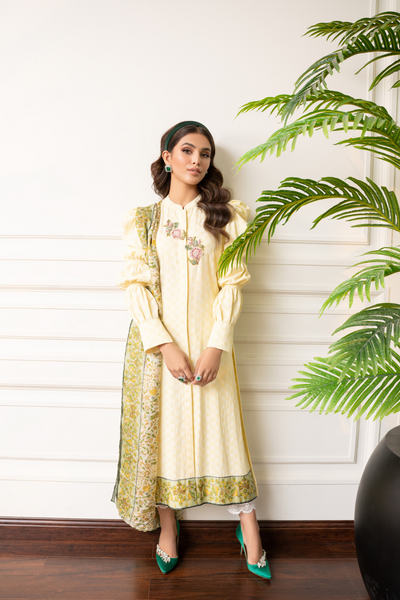 This lime yellow open-front shirt from Zainab Salman’s Mirage Luxury Pret collection features exquisite hand-embellished motifs and bold statement puff sleeves. Made from luxurious winter jacquard fabric, it offers both warmth and style. The shirt is complemented with a printed silk dupatta, adding an elegant touch. Its vibrant color and intricate detailing make it perfect for festive or semi-formal occasions. Pants can be purchased separately to complete the look, ensuring versatility and a personalized style.