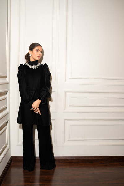 This stunning black velvet statement piece from Zainab Salman’s Mirage Luxury Pret collection features a high neck and a 3D hand-embellished neckline, adorned with intricate detailing. The gathered sleeves, enhanced with pearls, add a touch of elegance and sophistication. Paired with bootcut velvet pants, this ensemble effortlessly combines modern flair with timeless luxury. Ideal for making a bold fashion statement at upscale events, this outfit offers a perfect blend of style, comfort, and grace.