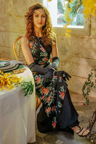 A black drape dress featuring floral silk printed pleated drape, and thread embroidered cutwork neckline. It can be paired with bootcut pants. Dress length: 53 inches