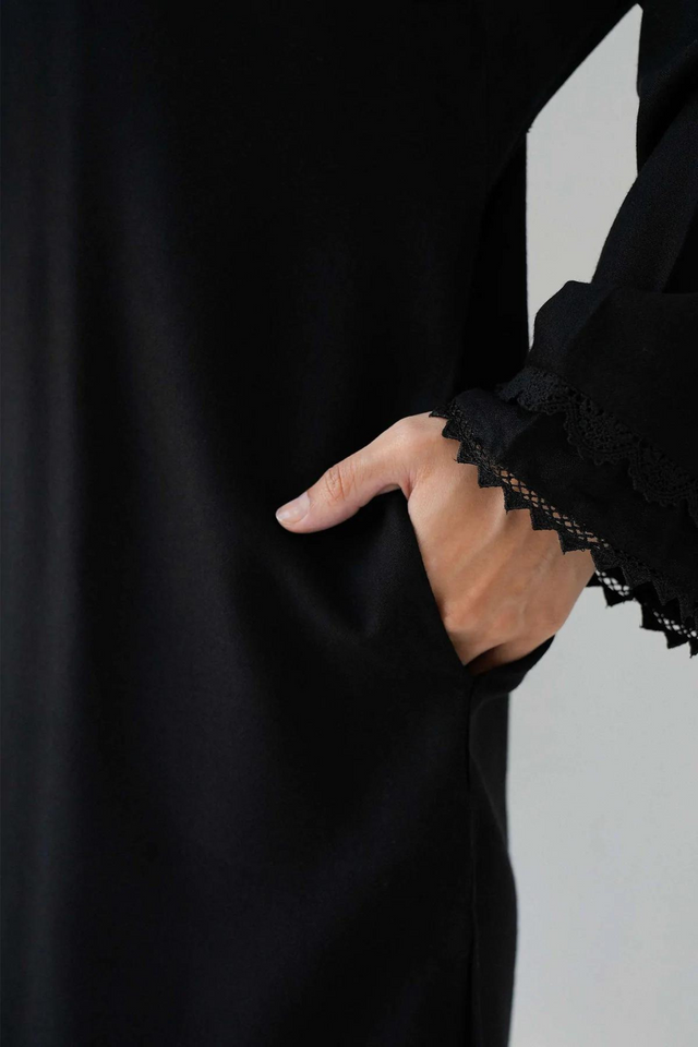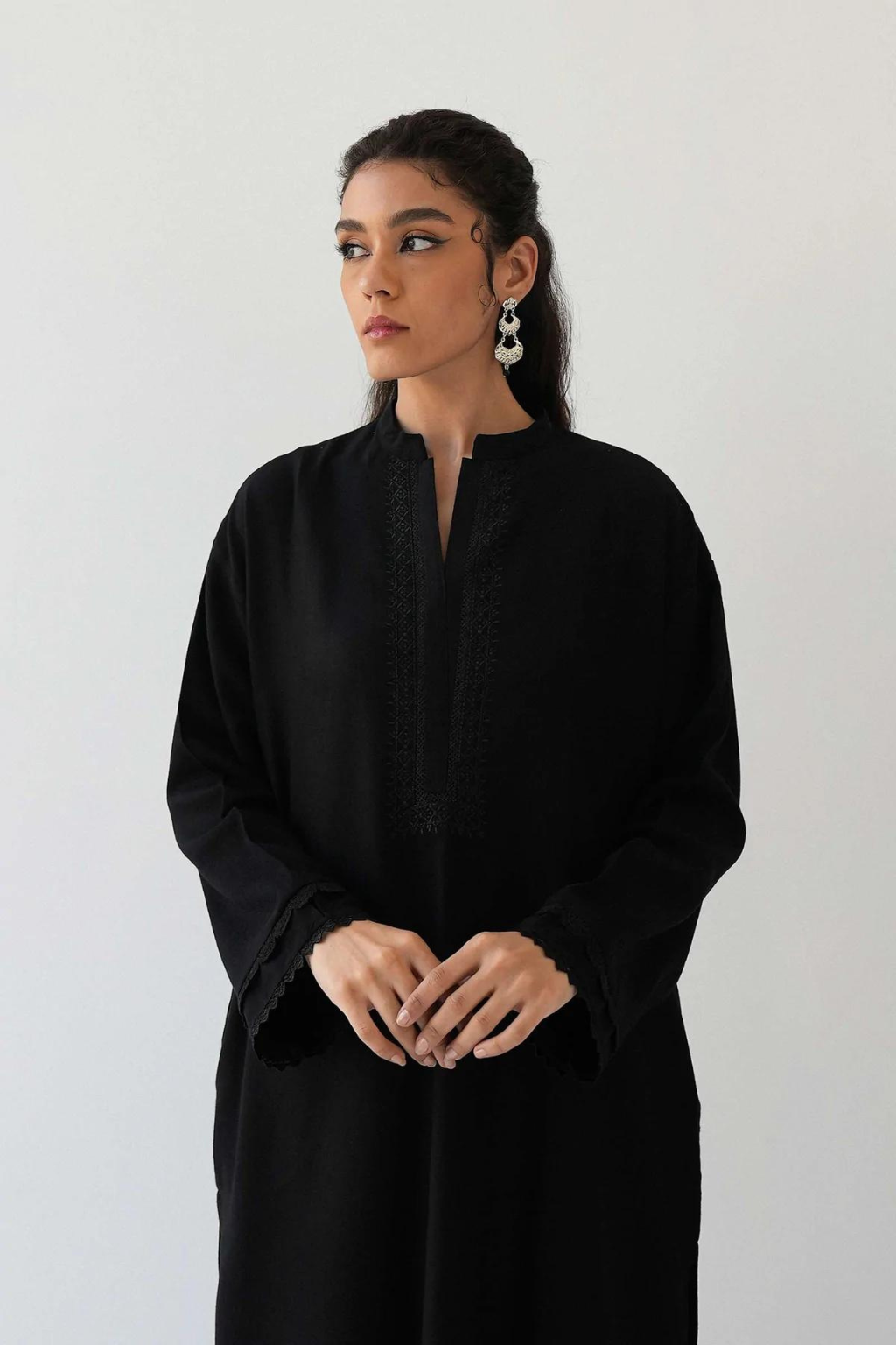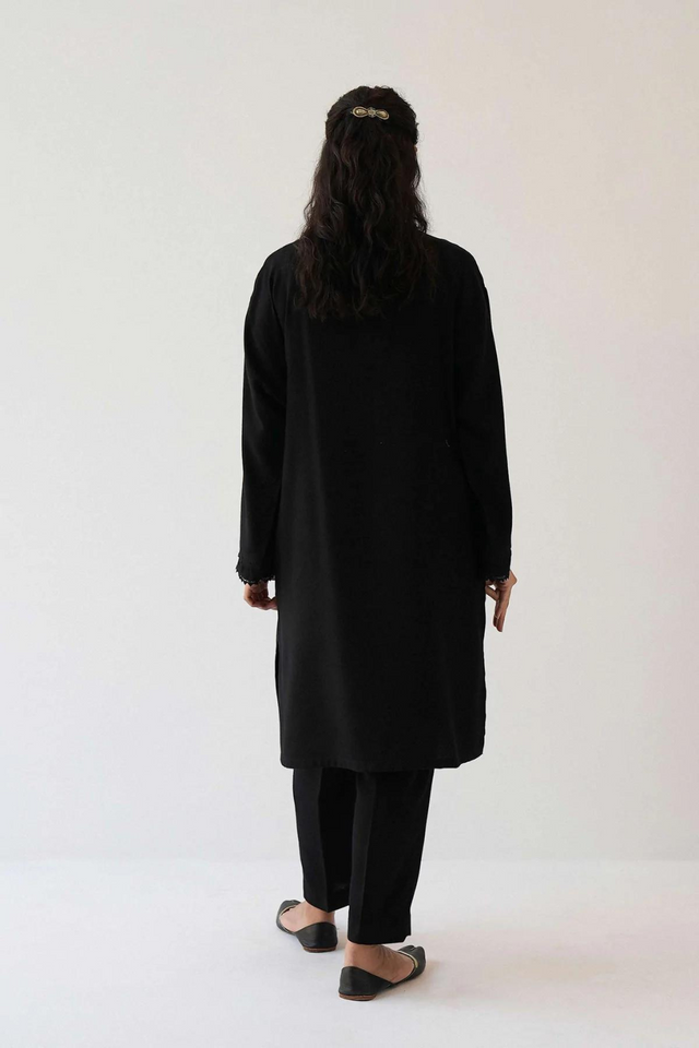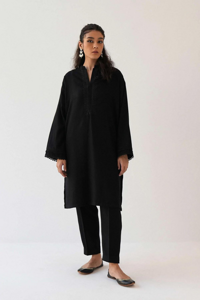 Shirt – wool peach Trouser – wool peach Loose-fit kurta and trouser in black, with embroidery on the kurta neckline.