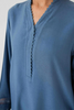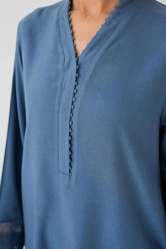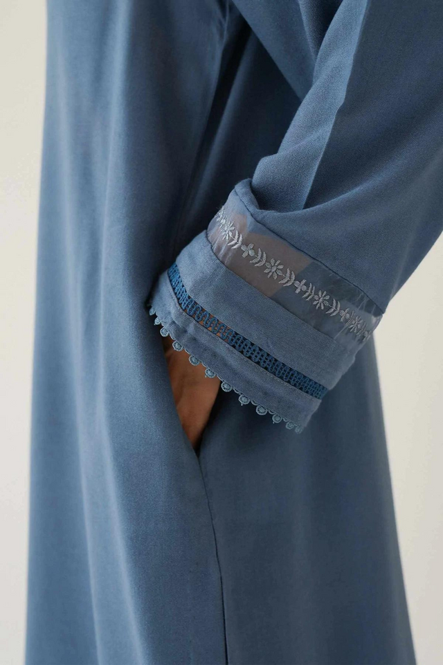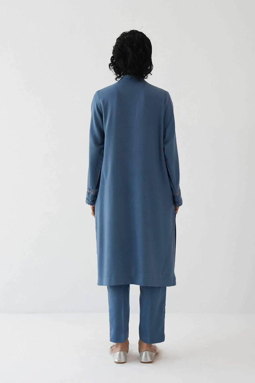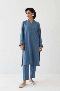 Shirt – wool peach Trouser – wool peach Loose-fit kurta and trouser in pigeon blue, embroidered and detailed on the kurta sleeve.