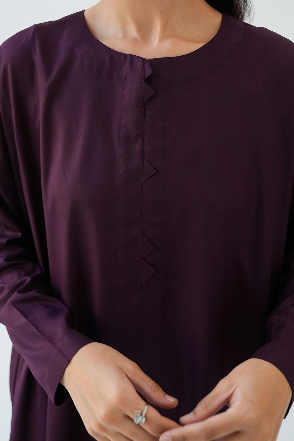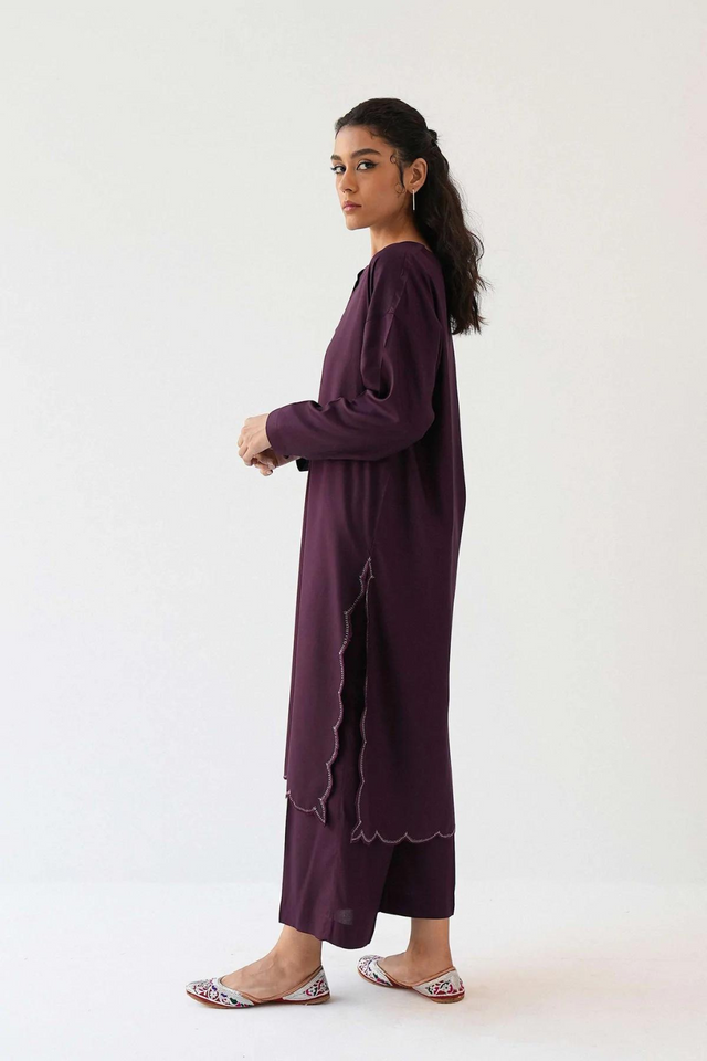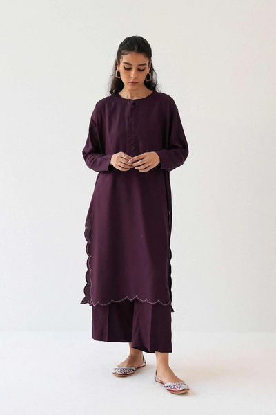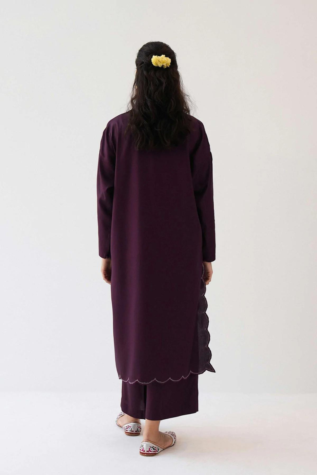 Shirt – Linen Trouser – Linen Loose-fit kurta set in deep purple, embroidered at the hemline