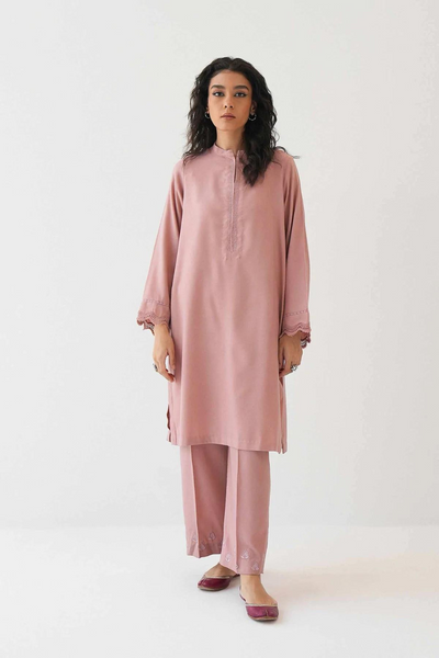 Shirt – wool peach Trouser – wool peach Loose-fit kurta with an embroidered trouser in tea pink, with embroidery at the kurta side seam.