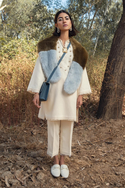 The Anya Set from Zainab Zulfiqar’s Fall/Winter '22 collection is a timeless pure karandi ensemble that combines classic elegance with modern flair. The shirt features double pleating and fringe detailing, adding depth and texture to the design. A subtle drop of pearls on each side of the neckline elevates the look, making it perfect for both day and night occasions. Paired with matching culottes, this set is a versatile addition to any wardrobe, offering both sophistication and style in one ensemble.