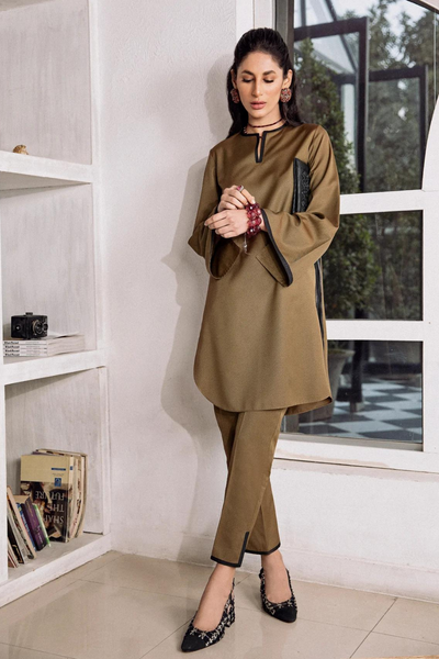 Elevate your winter wardrobe with the Nima Set from Zainab Zulfiqar’s Fall/Winter '22 collection. Crafted from a premium cotton and wool blend, this olive-toned ensemble features a rounded hem shirt adorned with contrasting black edging and contemporary side slit sleeves. The set is completed with matching tailored pants featuring subtle side slits, offering a refined yet comfortable silhouette. Perfect for seasonal layering, the Nima set brings together warmth, structure, and effortless style — ideal for both casual outings and elevated everyday wear.