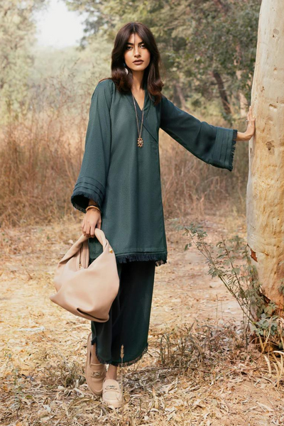 Dina from Zainab Zulfiqar’s Fall Winter '22 collection is a chic green two-piece set that exudes modern sophistication. The ensemble includes a blazer-style short shirt, offering a structured yet stylish silhouette, and is paired with round-cut culotte pants featuring fringe detailing for added texture and flair. Perfect for fashion-forward individuals, this outfit blends contemporary tailoring with playful accents, making it an ideal choice for both day and evening wear.