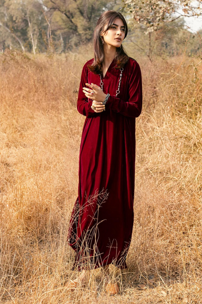 Heer by Zainab Zulfiqar from the Fall Winter '22 collection is a contemporary statement piece featuring a modern V-cut neckline and the brand’s signature cowl hem long shirt. The design is elevated with gathered sleeves, adding volume and flair to the silhouette. It is paired with sleek, straight-cut pants that perfectly complement the flow of the shirt. This ensemble seamlessly blends minimalist elegance with modern tailoring, making it ideal for semi-formal gatherings or chic winter evenings. A stylish and versatile addition to your seasonal wardrobe.