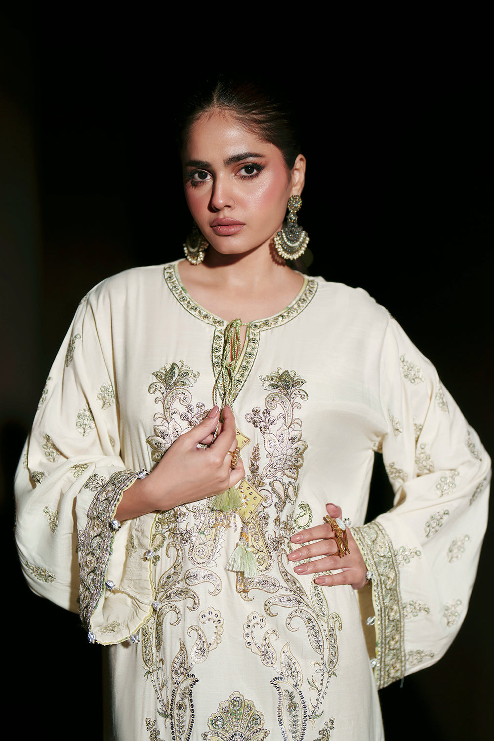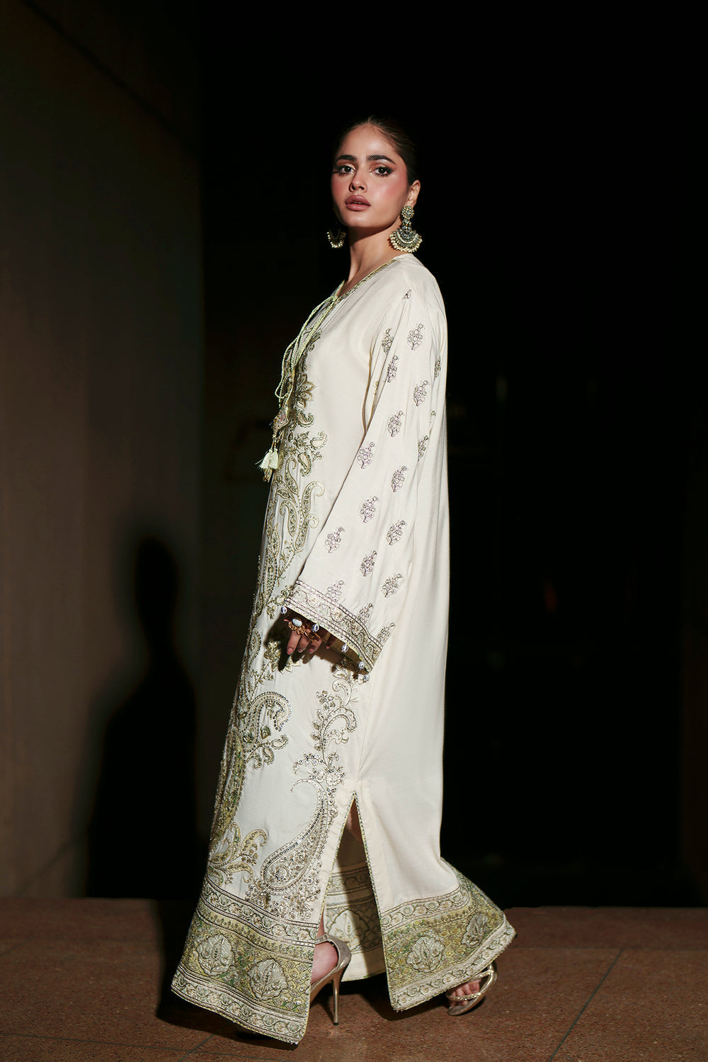 Envelop yourself in dramatic elegance with this stunning embroidered long shirt, crafted in a soft, flowing fabric. The floor-length silhouette is richly adorned with heavy embroidery in matt gold and silver threads, creating a luxurious and refined look. Ornate paisley motifs, delicate floral patterns, and geometric borders run gracefully down the front, around the hem, and across the wide sleeves, which are finished with elegant hanging bead details. The wide, round neckline with a subtle slit is enhanced with matching embroidery and tassels, adding a touch of artisanal charm. Designed to flow beautifully with every movement, this statement piece is perfect for sophisticated evenings and festive occasions.