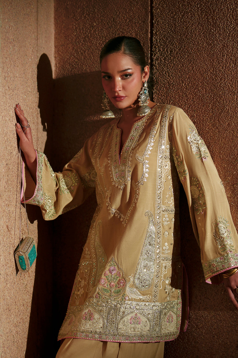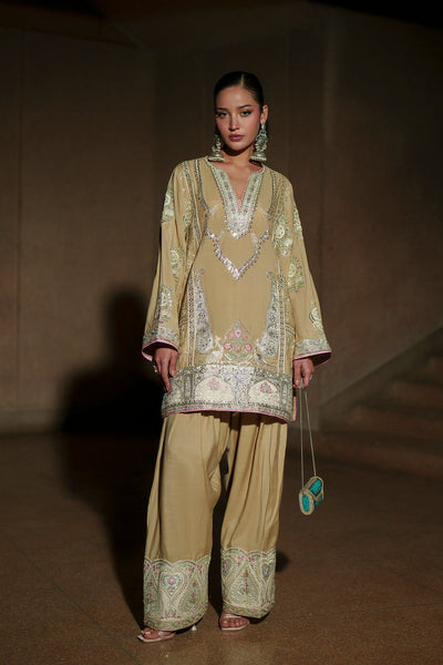 Embrace timeless grace with this beautiful pastel two-piece ensemble, crafted for refined style and comfort. The pristine kurta is detailed with intricate floral embroidery and patchworked accents in matt gold, pink, and white across the front, sleeves, and neckline, adding depth and elegance to the design. Paired with a wide-leg shalwar finished with a matching patchworked border, the outfit flows gracefully and creates a polished silhouette. Perfect for formal gatherings and festive celebrations, this ensemble reflects understated luxury with a timeless appeal.
