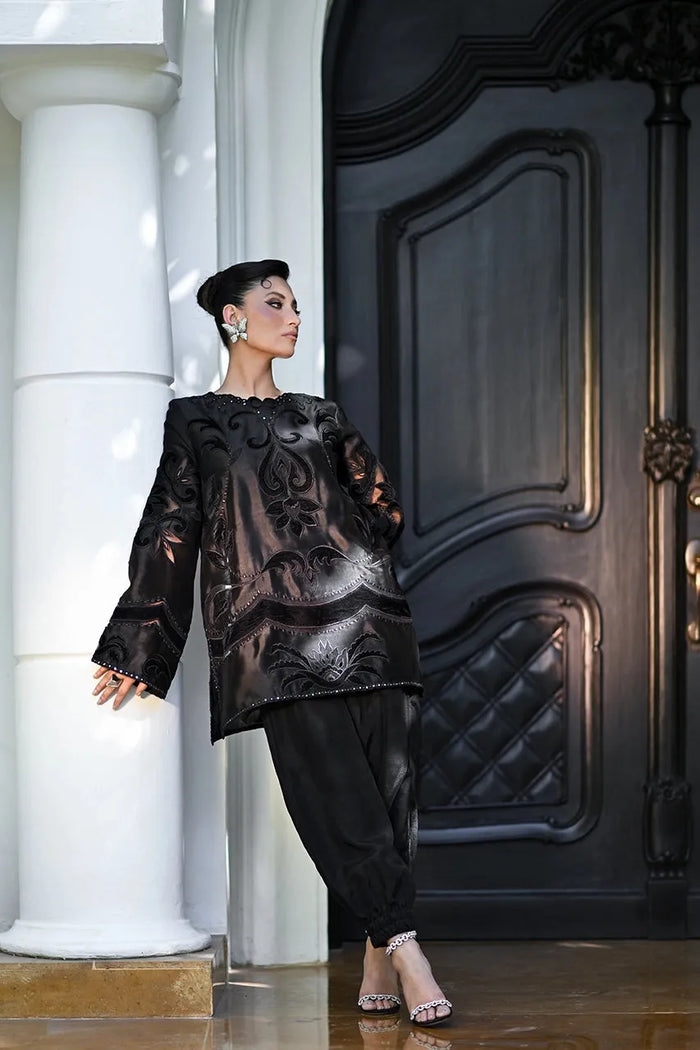 Cut from lustrous ebony hued sheesha silk, Velvet Pearl exudes quiet luxury through its intricate embroidery and velvet appliques. The relaxed top is adorned with resham in self & framed by applique borders. Intricate mirror work along the neckline, sides and hem complete the look. Paired with matching silk tapered shalwar, the look reimagines timeless craftsmanship with a modern sensibility.