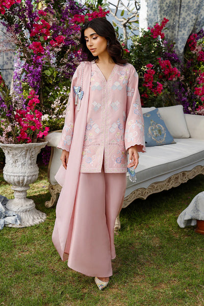 Elevate your style with this must-have ensemble, featuring a ravishing Baby Pink Raw Silk shirt that commands attention. The intricate contrasting applique work and embroidery on the front create a rich, opulent look, exuding luxury and sophistication. Paired with free-flowing Raw Silk pants for a flattering and comfortable fit, the outfit strikes the perfect balance between elegance and ease. Completing the look, a draped silk dupatta with delicate tassels at the edges adds a touch of drama and whimsy, making this ensemble perfect for special occasions.