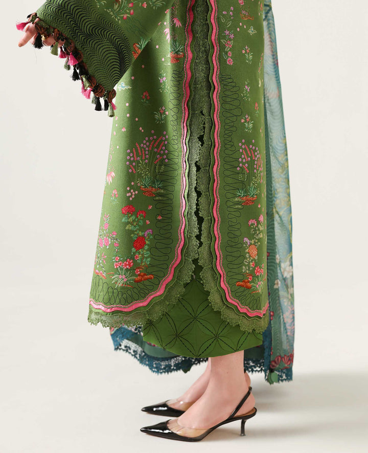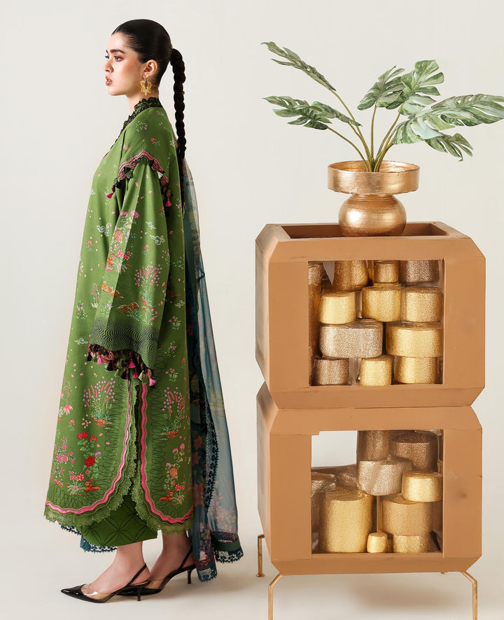 Deep olive green printed lawn unstitched outfit paired with a soft chiffon printed dupatta. Subtle embroidery on the neckline adds a refined touch, making it a perfect choice for effortless, graceful daily wear.