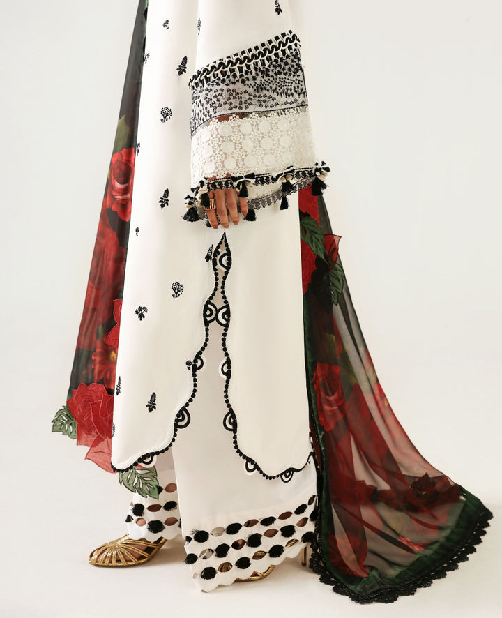 White lawn shirt adorned with delicate black floral embroidery featuring a prettily embroidered neckline and an exquisitely detailed organza border on the sleeves. Paired with a striking black dupatta highlighted by bold red rose motifs, this outfit blends elegance with a refined, statement finish.