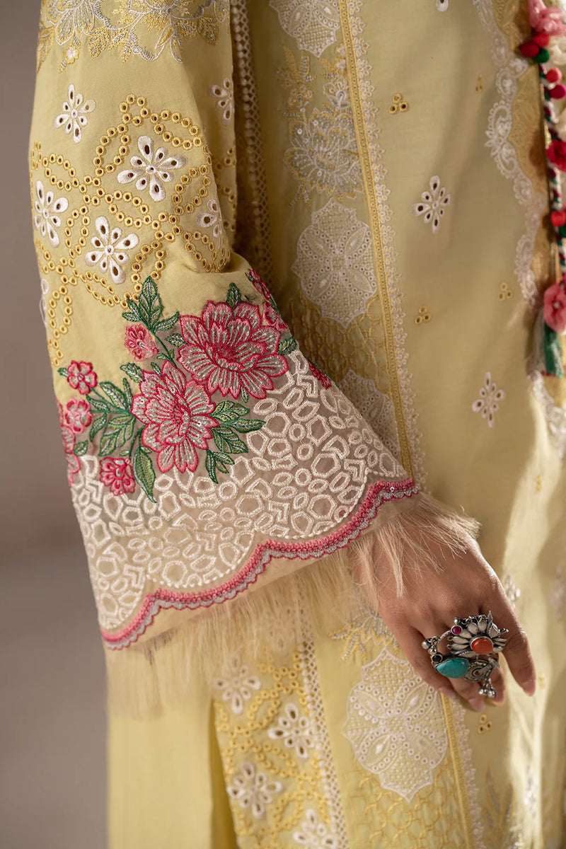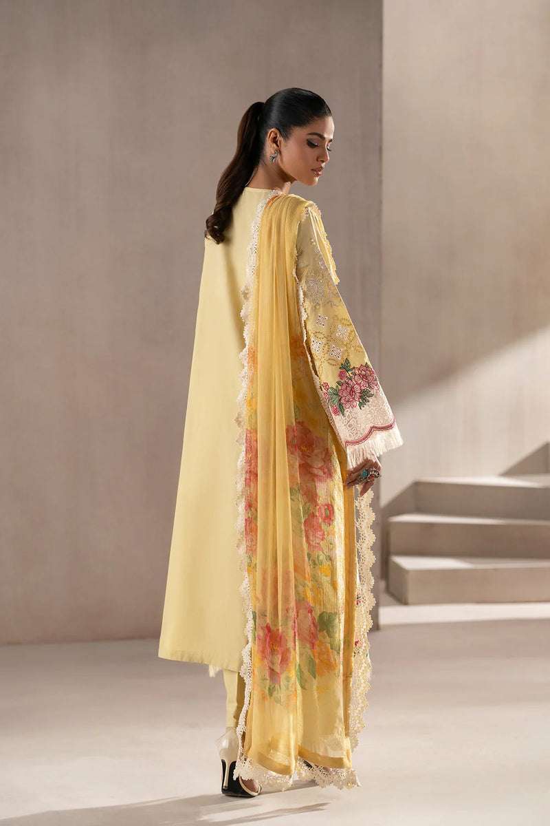 This exquisite 3-piece unstitched set features an embroidered dyed lawn shirt center panel (1 piece), embroidered dyed lawn shirt side panels (3 pieces), a dyed lawn shirt back (1 piece), and embroidered dyed lawn sleeves (2 pieces). It also includes embroidered organza sleeve borders (1 piece), embroidered organza hem borders (1 piece), a dyed lawn trouser (2.5 meters), and a digital printed chiffon dupatta (2.5 meters), all in a beautiful yellow beige color. The detailed embroidery and digital print add a touch of elegance to this set, making it perfect for custom tailoring. Note: Laces and embellishments are not included with unstitched articles.