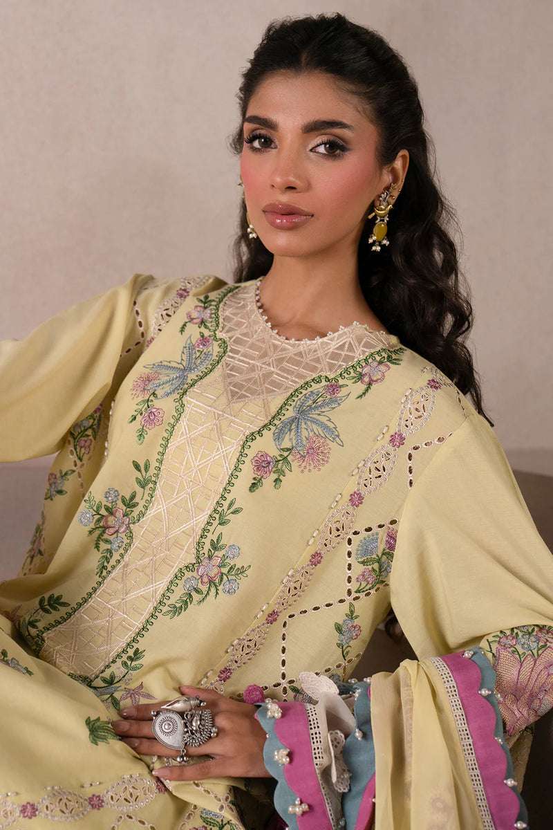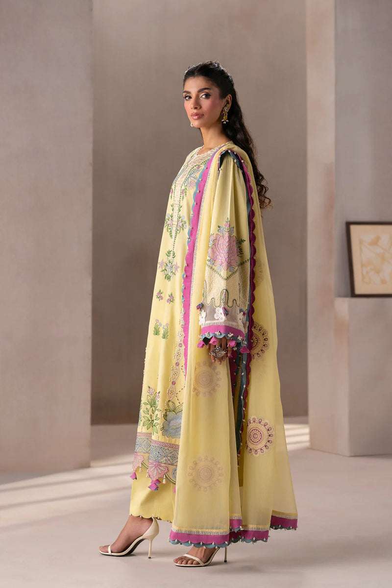 This elegant 3-piece unstitched set includes an embroidered neckline (1 piece), embroidered dyed lawn shirt center panel (1 piece), embroidered dyed lawn shirt side panels (2 pieces), a dyed lawn shirt back (1 piece), embroidered dyed lawn sleeves (2 pieces), and an embroidered organza hem border (1 piece). It also features a dyed lawn trouser (2.5 meters) and an embroidered dyed chiffon dupatta (2.5 meters), all in a warm yellow beige color. The intricate embroidery adds a refined touch to this beautiful set. Ideal for a customized, chic look. Note: Laces and embellishments are not included with unstitched articles.