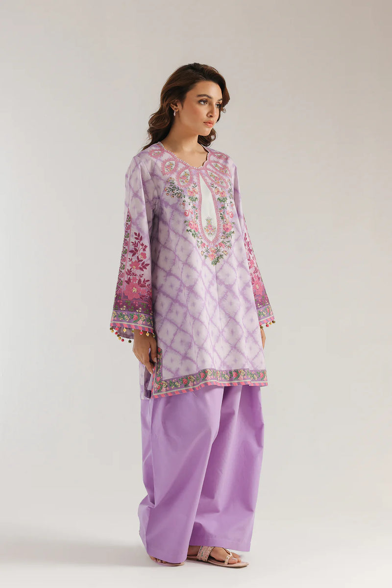 This chic 3-piece unstitched set includes embroidered printed lawn sleeves (2 pieces), a printed lawn shirt front and back (1 piece), a dyed cambric trouser (2.5 meters), and a printed chiffon dupatta (2.5 meters), all in a serene light purple color. The embroidered sleeves add a touch of sophistication, while the printed shirt and dupatta bring a stylish, modern flair. The dyed cambric trouser ensures comfort and durability. Perfect for various occasions, this set allows for customized tailoring to your preference. Please note that laces and embellishments are not included. A versatile and elegant addition to your wardrobe.