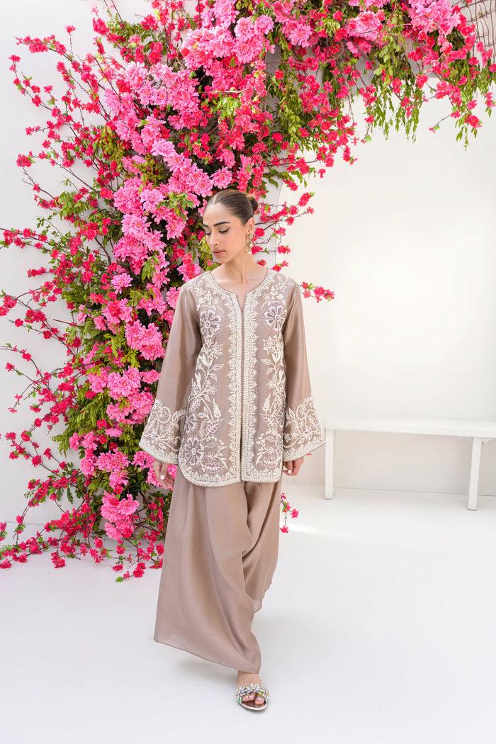 A stylish ensemble in dusty rose, featuring a short cape jacket paired with flowy pants. Crafted from premium pure sheesha silk, the shirt is machine-embellished with delicate handwork. A chic and elegant choice for the season. It’s a two piece set and the flowy pants are made on korean rawsilk.