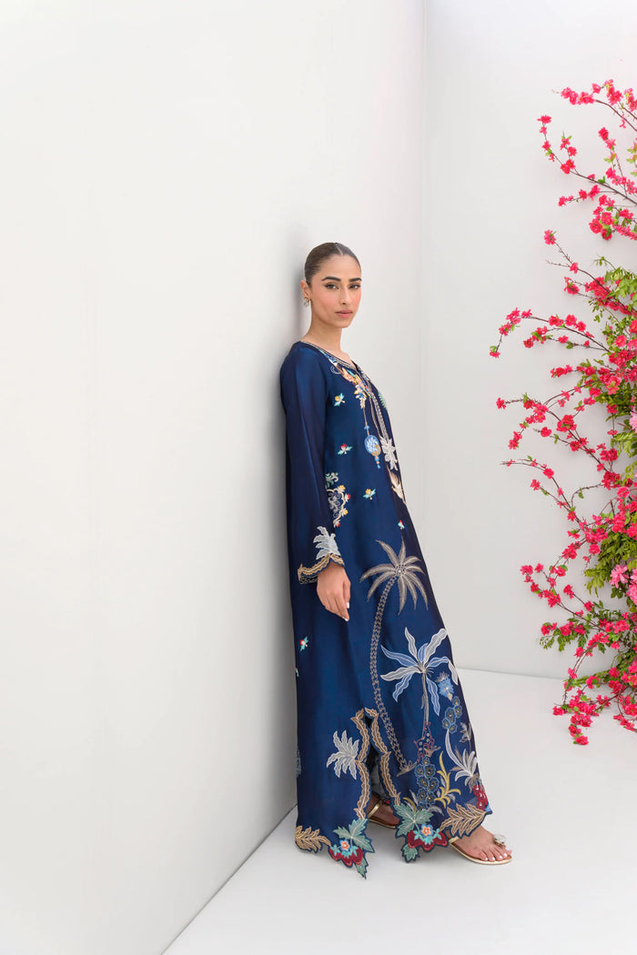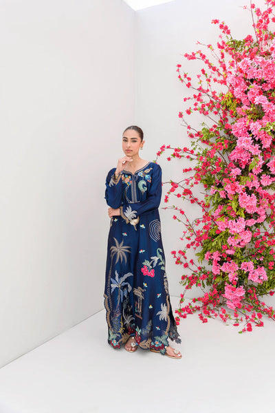 River Island is a long, pure sheesha silk kaftan featuring a stunning scenic print of palm trees, birds, cherries, and cozy shelters. Designed in a trendy, easy-breezy cut, it’s perfect for effortless summer style. The deep navy blue base is beautifully accented with machine embroidery and applique work in cranberry, ice blue, and beige tones, adding an elegant touch. it’s a two piece set.