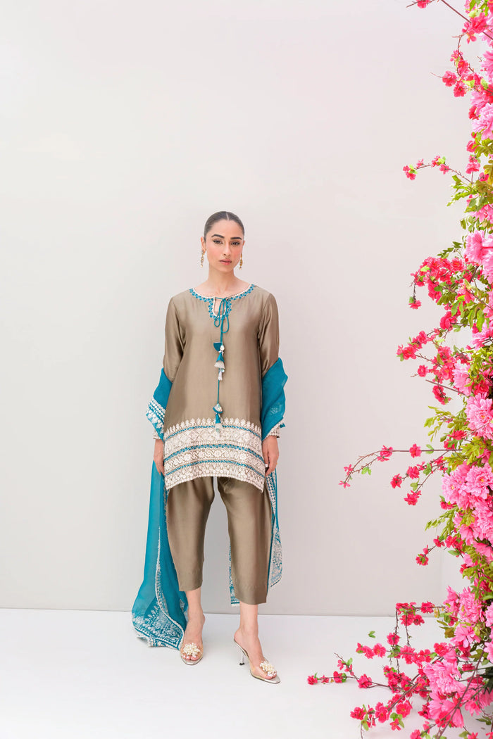 A contemporary dusty olive ensemble featuring a short-style shirt and sleek skinny shalwar, both tailored in pure sheesha silk. The teal green pure kittan organza dupatta adds a striking contrast. Adorned with intricate aari work in pearl and teal shades, this set is the perfect blend of subtle tones and modern detailing.
