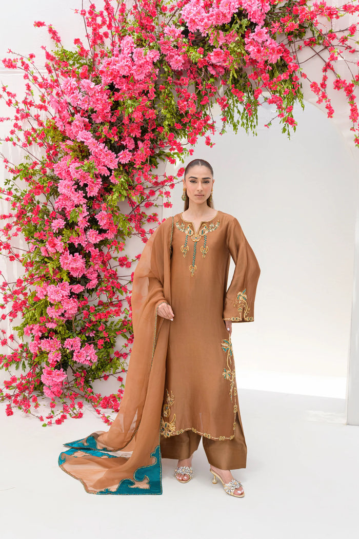 A rich coffee-toned ensemble featuring a trendy long shirt paired with a classic farshi shalwar, both tailored from pure Sheesha silk. The shirt is intricately embellished with Dabka, Kora, and Resham work in elegant copper tones, while the pure Kattan organza dupatta is finished with striking teal appliqués along the edges—blending tradition with contemporary flair.
