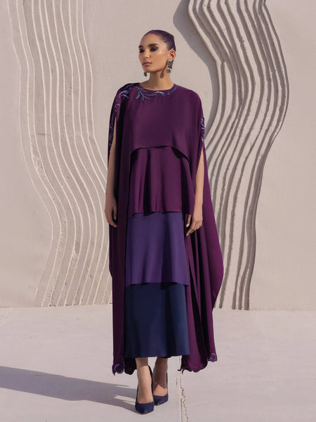 This stunning purple fully appliquéd cape is beautifully paired with a long slip featuring shades of purple and blue, creating a captivating and layered look. The cape, measuring 52 inches in length, drapes elegantly over the body, while the slip adds a sleek, flowing silhouette with a 49-inch length. The ensemble is completed with navy blue straight trousers (36 inches), offering a structured and comfortable fit. Perfect for evening wear or formal occasions, this outfit combines intricate detailing with modern design. For care, dry clean only. Please note, actual colors may vary depending on your device's display.