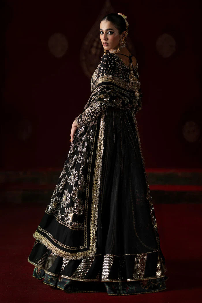 A timeless black pishwas adorned with intricate handwork on the bodice, paired with a classic printed lehenga. The look is elevated with a heavily sequined dupatta, exuding old-world heritage charm with an everlasting grace
